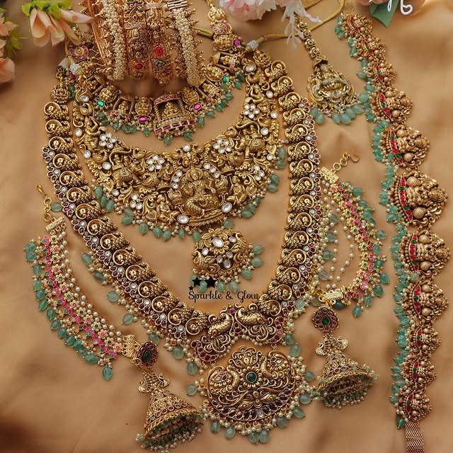 This Grand Lakshmi Peacock carved guttapusalu bridal set showcases exquisite craftsmanship with intricate detailing of Lakshmi and peacock motifs. Designed for brides seeking traditional elegance, the guttapusalu beads add a classic touch while ensuring durability. Perfect for enhancing bridal attire with a rich cultural heritage, this set combines artistry and timeless beauty for a distinguished look on your special day.